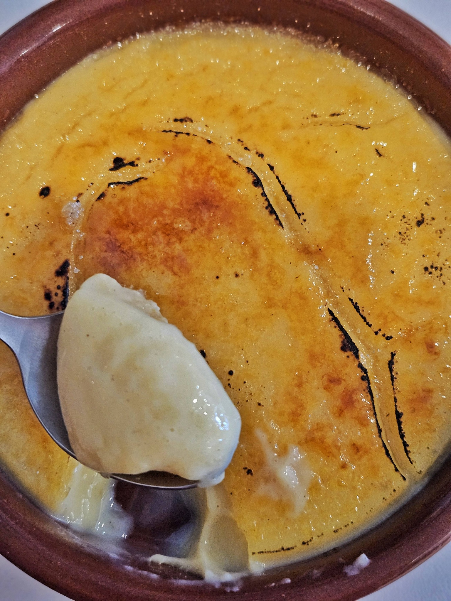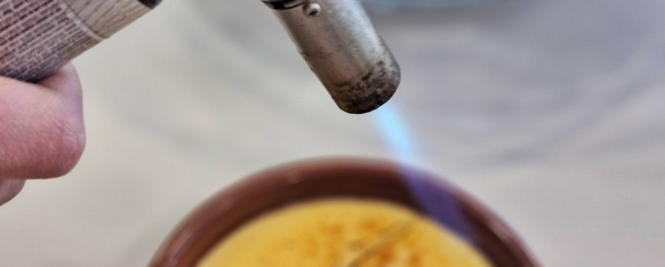 Ez a karamellizálás kulcseleme a desszertnek: a cukrot mindig frissen, a felszolgálás előtt égetik rá a tetejére, így a vendég valóban frissen roppanó kérget kap, amely alatt lágy, illatos krém bújik meg.