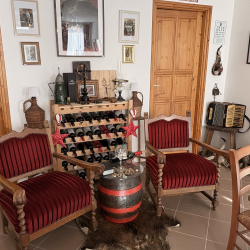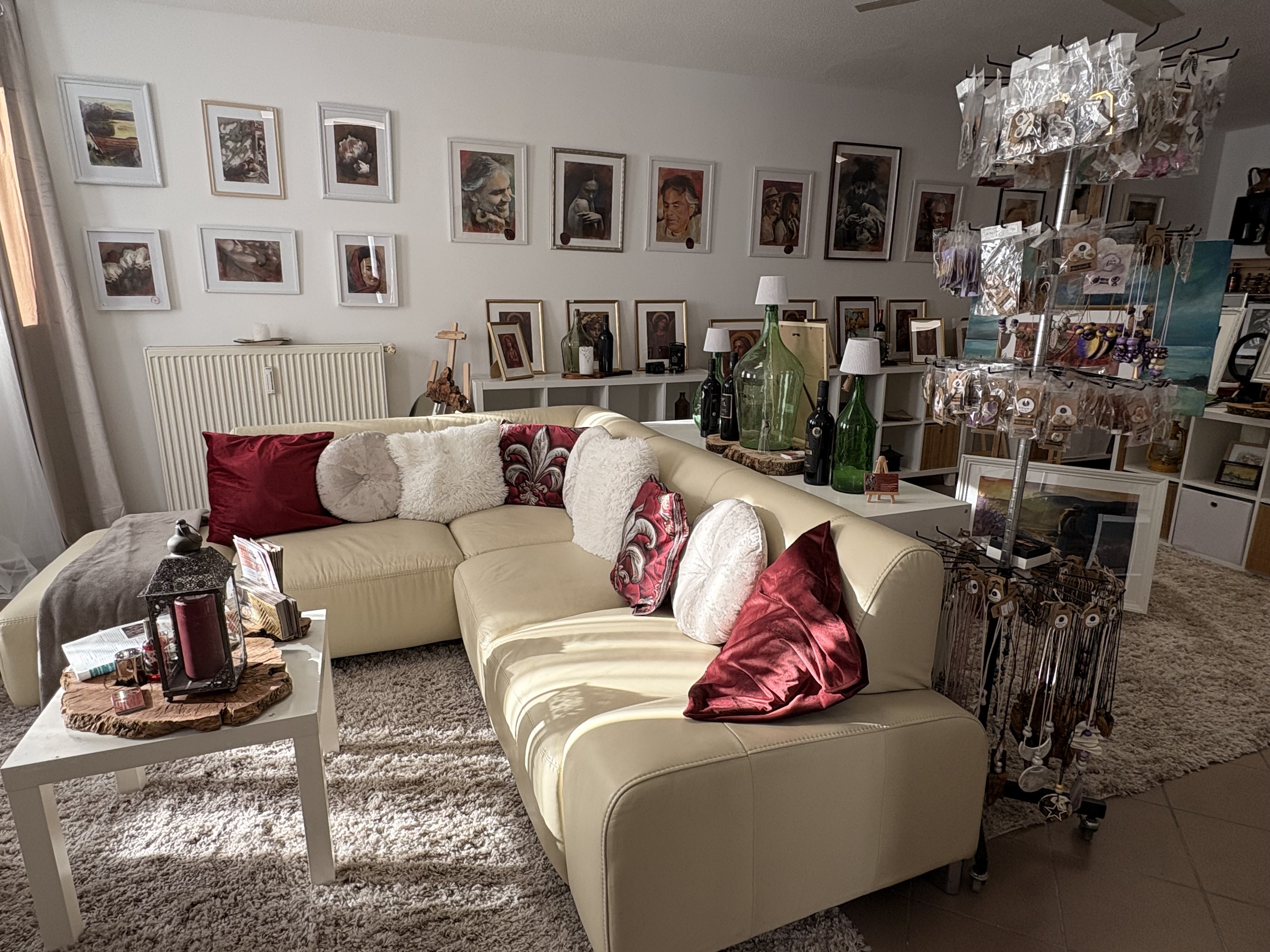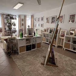 „Itt több mint 100 képem ki van állítva… ez egy állandó kiállítás, ami folyamatosan megújul, mert mindig cserélgetem a képeket.” A galériában van egy külön tér is, amiről láthatóan örömmel beszél: „egy úgynevezett Bacchus terem, ahol 20 fő le tud ülni.”