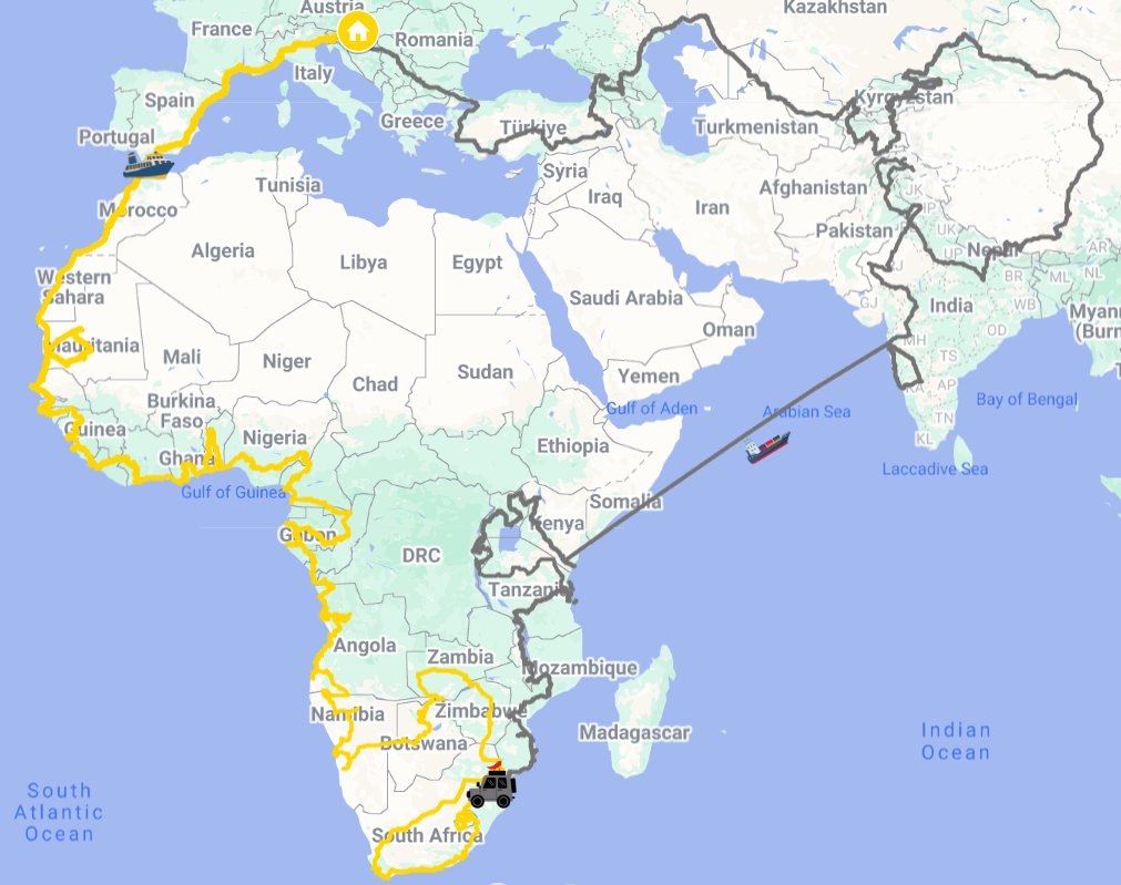 Afrikában 32 országon haladtak át. Nyugat-Afrikától Közép-Afrikán keresztül jutottak el Dél-Afrika legdélibb pontjáig, majd Kelet-Afrikán haladtak tovább. Az út nem „száguldás" volt, hanem lassú haladás, alkalmazkodás, figyelés.