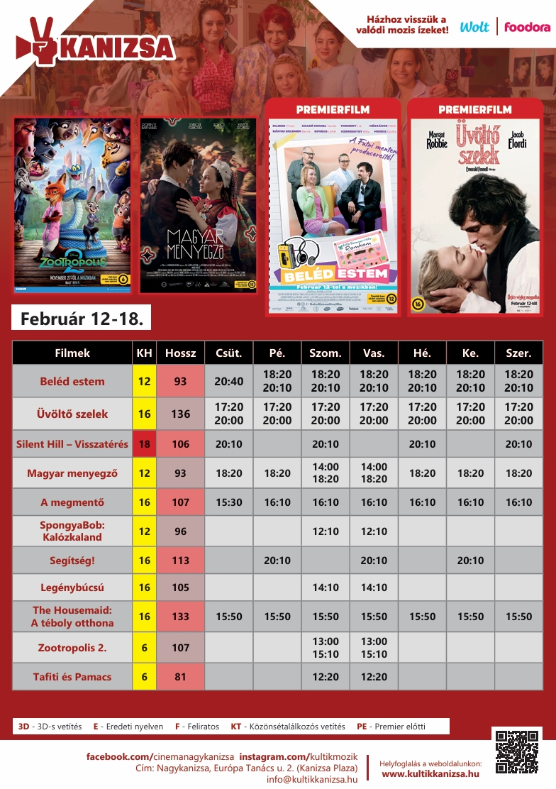 A Kultik Kanizsa Mozi változatos műsorral, premierfilmekkel és közönségkedvencekkel várja a nézőket február 12. és 18. között, a részletes vetítési időpontok és jegyfoglalási lehetőségek a mozi hivatalos felületein érhetők el.