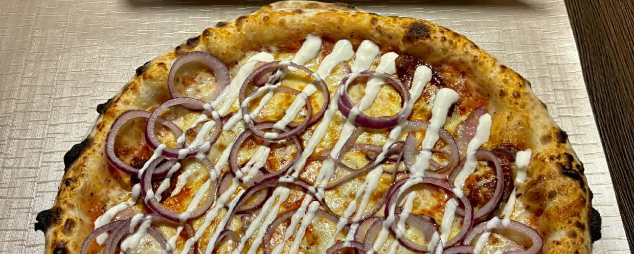 A pizzát a kemencéből kivéve kapja meg az igazi karakterét. A forró alapra frissen szelt, enyhén sózott lila hagyma kerül, amely megőrzi roppanósságát, és kontrasztot képez a sültek melegségével. Nem párolt, nem sült – tudatosan friss marad. Ez a textúra- és hőmérsékletbeli különbség adja az első meglepetést.