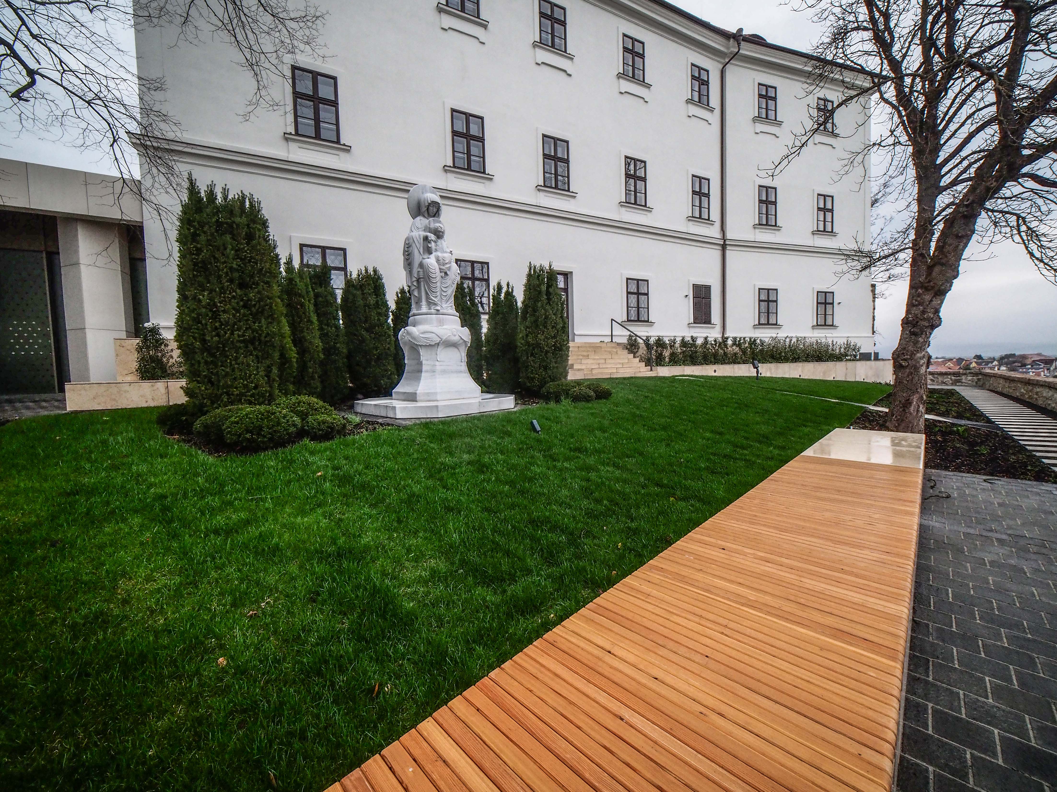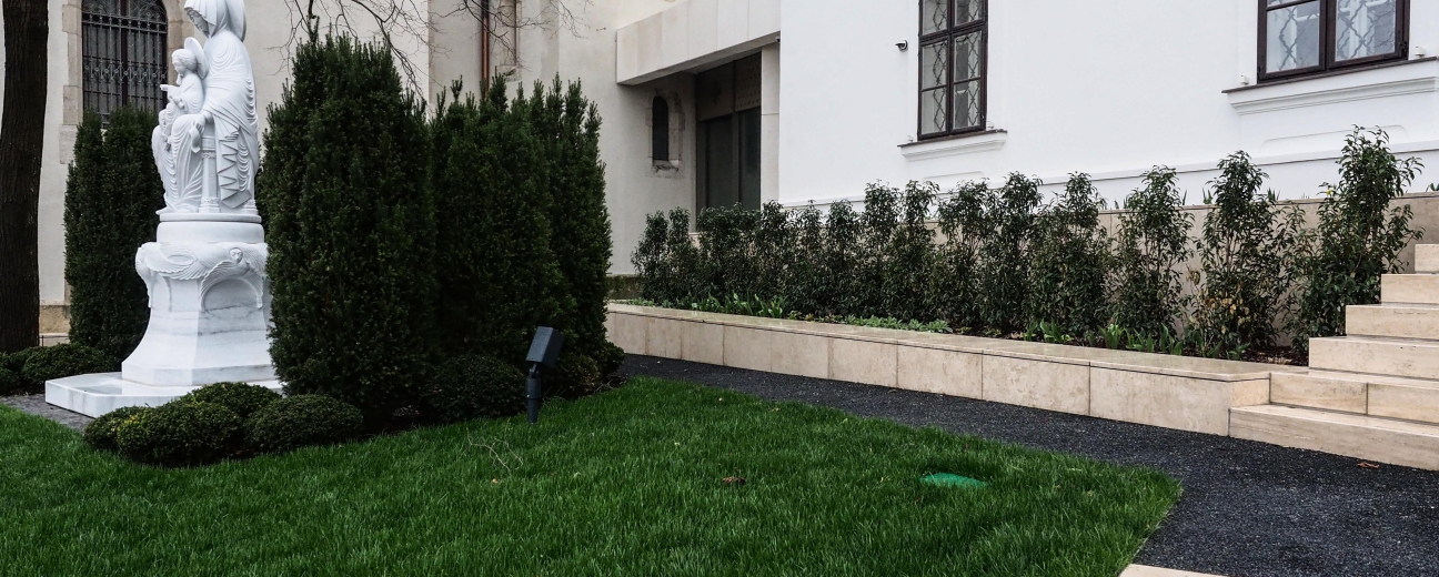 A Nagyszeminárium északi kertjében árnyas pihenőhely és kilátópont, míg a keleti kertben Varga Ferenc Munkácsy-díjas szobrászművész Trónon Ülő Istenanya szobra, valamint az egykori vadgesztenyesor időtlenséget sugalló, megmentett példányai hívnak elcsendesedésre.